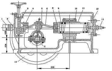①、14-大皮帶輪 ②、5-搖動桿 ③、9-彈簧 ④、7-偏心軸 ⑤、6-肘板   ⑥、鞍形基腳上搖動盒的撐板