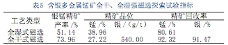 3、分級(jí)-干濕分選的強(qiáng)磁選流程是該礦的高效流程。探索試驗(yàn)表明,采用全濕式強(qiáng)磁選,精礦品位較高,但錳、銀的回收率低;而采用全干式強(qiáng)磁選,銀錳的回收率高但精礦品位低,試驗(yàn)結(jié)果見表5。