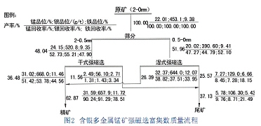 根據(jù)該含銀多金屬錳礦的性質(zhì),以及強(qiáng)磁選設(shè)備的特點(diǎn),制定了干式篩分分級(jí)-粗粒干式強(qiáng)磁選-細(xì)粒濕式強(qiáng)磁選的工藝流程。試驗(yàn)流程及結(jié)果見圖2,精礦化學(xué)多元素分析結(jié)果見表6。