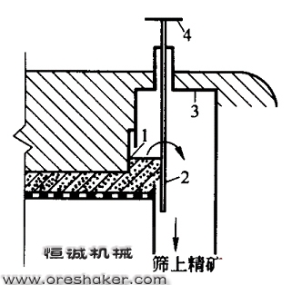 (3)一端排料法這是在跳汰室末端篩面上或端壁上沿橫向開口以排出重產品的方法。為了控制排出速度,常在開口處設置各種排料裝置。選礦用的跳汰機一般設置簡單的垂直閘門,如圖4所示。圖中外閘門的作用是防止輕礦物進入到重產品中,內閘門則用以控制排料速度,兩者高度均可調節。閘門上方的蓋板開孔,以使內部壓力與大氣相通,便于物料流動。