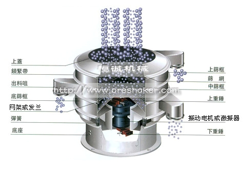 LT系列旋振篩,由直立式電機作激振源,電機上、下兩端安裝有偏心重錘,將電機的旋轉運動轉變為水平、垂直、傾斜的三次元運動,再把這個運動傳遞給篩面。調節上、下兩端的相位角,可以改變物料在篩面上的運動軌跡。
