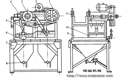 1-傳動(dòng)部分;2-電動(dòng)機(jī);3-分水閥;4-搖臂;5-連桿;6-橡膠隔膜;7-機(jī)架;8-排礦閥門;9-跳汰室;10-隔膜室;11-網(wǎng)室