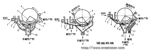 以上為三種類型磁選機底箱示意圖a-半逆流型;b-逆流型;c-順流型