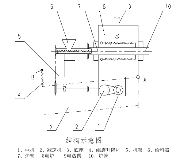 動力部分采用一臺0.6KW的調速電機,通過減速箱,帶動傳動軸,又經過鏈條帶動爐管旋轉。加料器和傳動軸間設置了一個三檔變速器,使給料量增加了調節的余地。電機和減速箱設置在爐體下面,整體較為緊湊。
