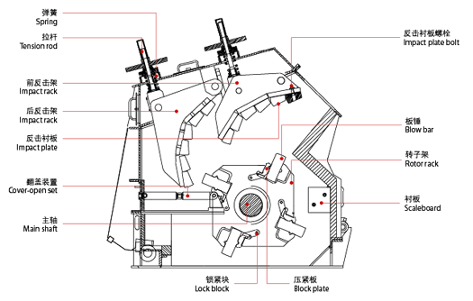 反擊式破碎機是一種利用沖擊能來破碎物料的破碎機械。該機工作時,在電動機的帶動下,轉(zhuǎn)子高速旋轉(zhuǎn),物料進入板錘作用區(qū)時,與轉(zhuǎn)子上的板錘撞擊破碎,后又被拋向反擊裝置上再次破碎,然后又從反擊襯板上彈回到板錘作用區(qū)重新破碎,此過程重復進行,物料由大到小進入一、二、三、反擊腔重復進行破碎,直到物料被破碎至所需粒度,由出料口排出。調(diào)整反擊架與轉(zhuǎn)子之間的間隙可達到改變物料出料粒度和物料形狀的目的。 |