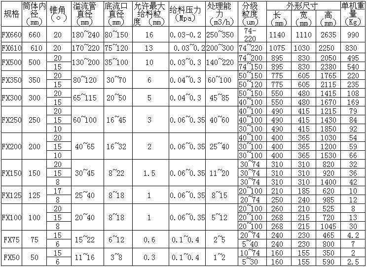 根據磨礦處理量、溢流細度和沉砂濃度的要求,正確選擇合適規格及型號的旋流器,是能否達到最優化工作條件的前提。可為用戶提供Φ50、Φ75、Φ100、Φ125、Φ150、Φ200、Φ250、Φ300、Φ350、Φ500、Φ660等單機、并聯機組或串聯機組。