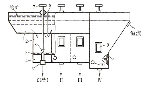 6-排礦調節塞;7-手輪;8-擋板(防止粗粒越室);9-玻璃窗;10-壓力水管 |