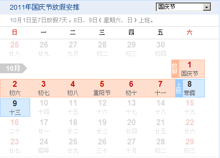 金秋十月,舉國同慶;神州大地,繁花似錦;家和國盛,樂曲如潮,借著這偉大而美麗的日子 送上我們最誠摯的祝福:天天開心,事事順意!國慶快樂! 2011年石城縣恒誠選礦設備制造廠 國慶節假日安排:10月1日至7日放假7天,8日、9日(星期六、日)上班。 有任何問題可咨詢:15879720520