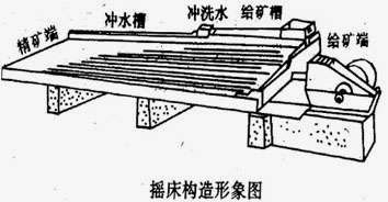 搖床選金是以搖床為主要設備的選金過程。 搖床是在水平介質流中進行選礦的設備,由床面和傳動機構兩部分組成(圖2),床面由傳動機構帶動作縱向往復運動。礦古在 搖床上的分選是在床面往復運動過程中逐步完成的。促成礦粒運動的因素,除自身重力外,主要是沖流和床面差動運動。礦粒在運動中經受垂直于床面的分層作用和平行于床面的分離作用。兩項作用的結果是不同礦粒自床面的不同區間排出。