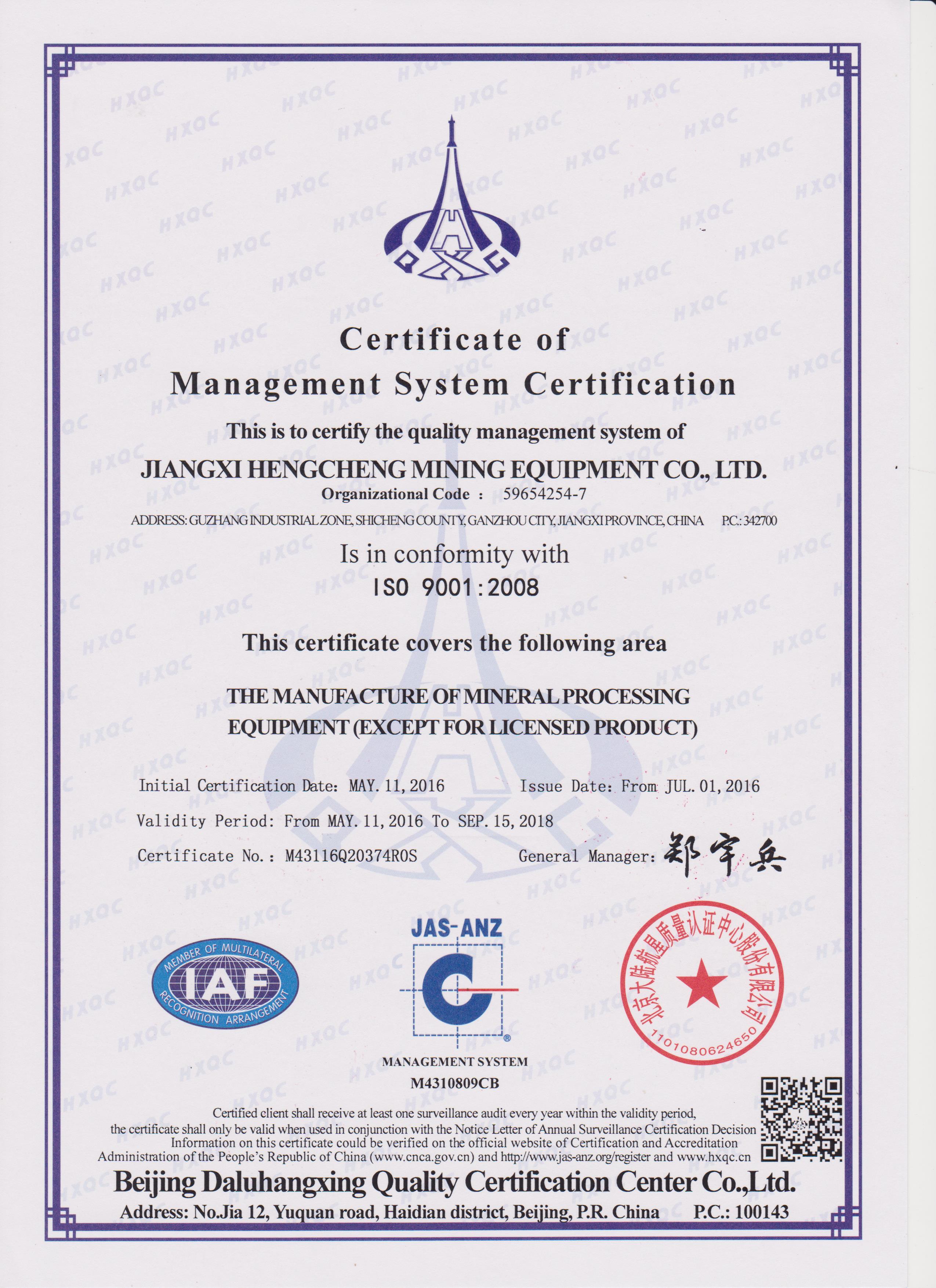 經過北京大陸航星質量認證中心股份有限公司BEIJING DALU HANGXING QUALITY CERTIFICATION CENTER CO.,LTD.的嚴格審核,公司榮獲國家認監委認可ISO9001:2008質量管理體系認證證書